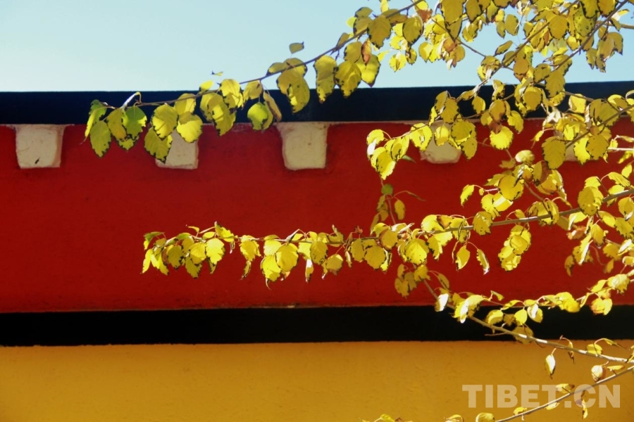 圖為阿里獅泉河鎮(zhèn),紅墻藍(lán)天黃葉相得映彰攝影:趙釗